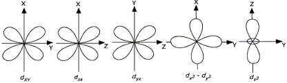 | Shapes of orbitals An orbital is the region of space around the nucleus where there is a fine probability of finding electrons .The plot of angular wave functions (probability functions ) give us the shapes of the orbitals. Shape of s-orbitals For s-orbitals ,when l=0,the value of m is '0' which means there is one possible orientation and the probability of finding an electron is the same in all directions at a given distance from the nucleus .For this reason it should be spherical in shape .Hence all orbitals are non directional and spherically symmetrical about the nucleus .The size of an s-orbital depends upon value of the principal quantum number' n'.Greater the value of 'n' larger is the size of the orbital. In 2s orbital there is a nodal position where the probability of finding electron is zero .The number of nodal surfaces in 's' orbital of any energy level is equal to (n-l) ,where 'n' is the principal quantum number Shape of p- orbitals 'p' orbitals have dumbbell shape and have directional character.The probability of finding electron' is equal in both the lobes.Two lobes of each orbital are separated by a nodal plane .p'- orbitals can have three possible orientations .That is for a p-sub shell l=1 there are three values of 'm' namely -1,0,+1 .These three p-orbitals are in degenerate state but differ in their orientations .Each p-orbitals consists of two lobes symmetrical about a particular axis and are denoted as 2px,2py and 2pz . shape of d-orbitals For d-sub shell,l=2 there are five possible values of 'm' namely -2,-1,0,1,2. That means it can have five orientations .These are represented by dxy,dyz,dzx,dx2-y2 and dz2 . The dxy,dxz,dyz , have same shape and they lie in xy.xz,yz respectively . . |