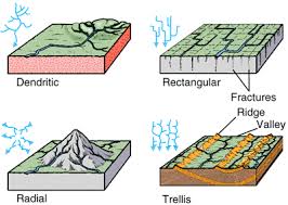 The rectangular drainage pattern is found in regions that have undergone faulting. Streams follow the path of least resistance and thus are concentrated in places were exposed rock is the weakest. Movement of the surface due to faulting off-sets the direction of the stream. As a result, the tributary streams make shape bends and enter the main stream at high angles. |