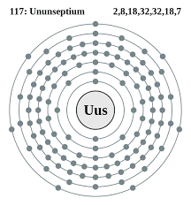 | Ununseptium (atomic number117 ,discovery -2010) is the latest discovered element by the joint institute for nuclear research in Dubna and Lawrence Livermore national laboratory .It is prepared by the bombardment of berkelium with calcium . Electron shell structure of ununseptium |
